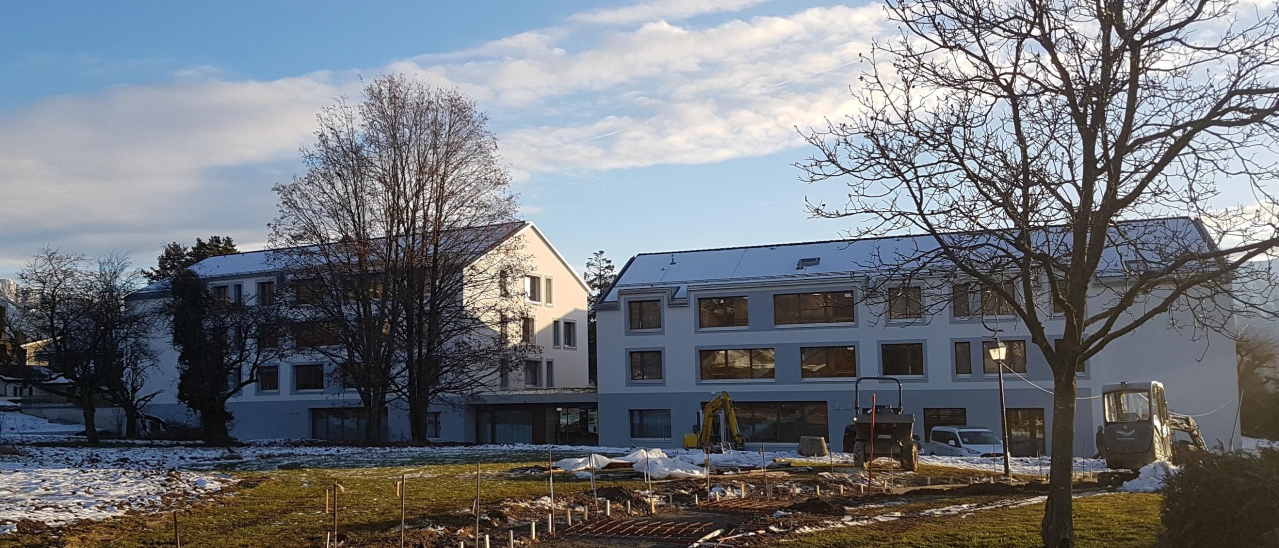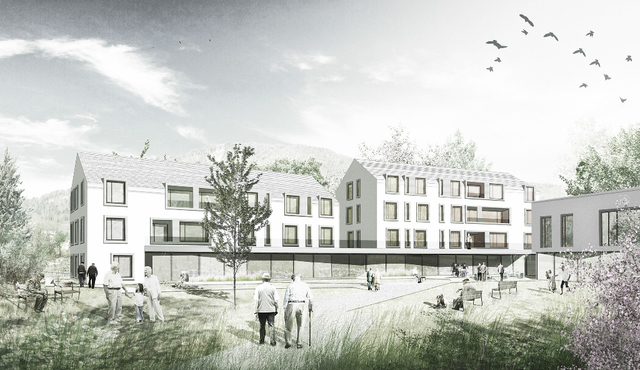 Erweiterung und Umbau der Pflegeeinrichtung Mon Repos in La Neuveville. Die Erweiterung erfolgt in Form eines neuen, vierstöckigen Gebäudes, das an das bestehende Gebäude angrenzt.
