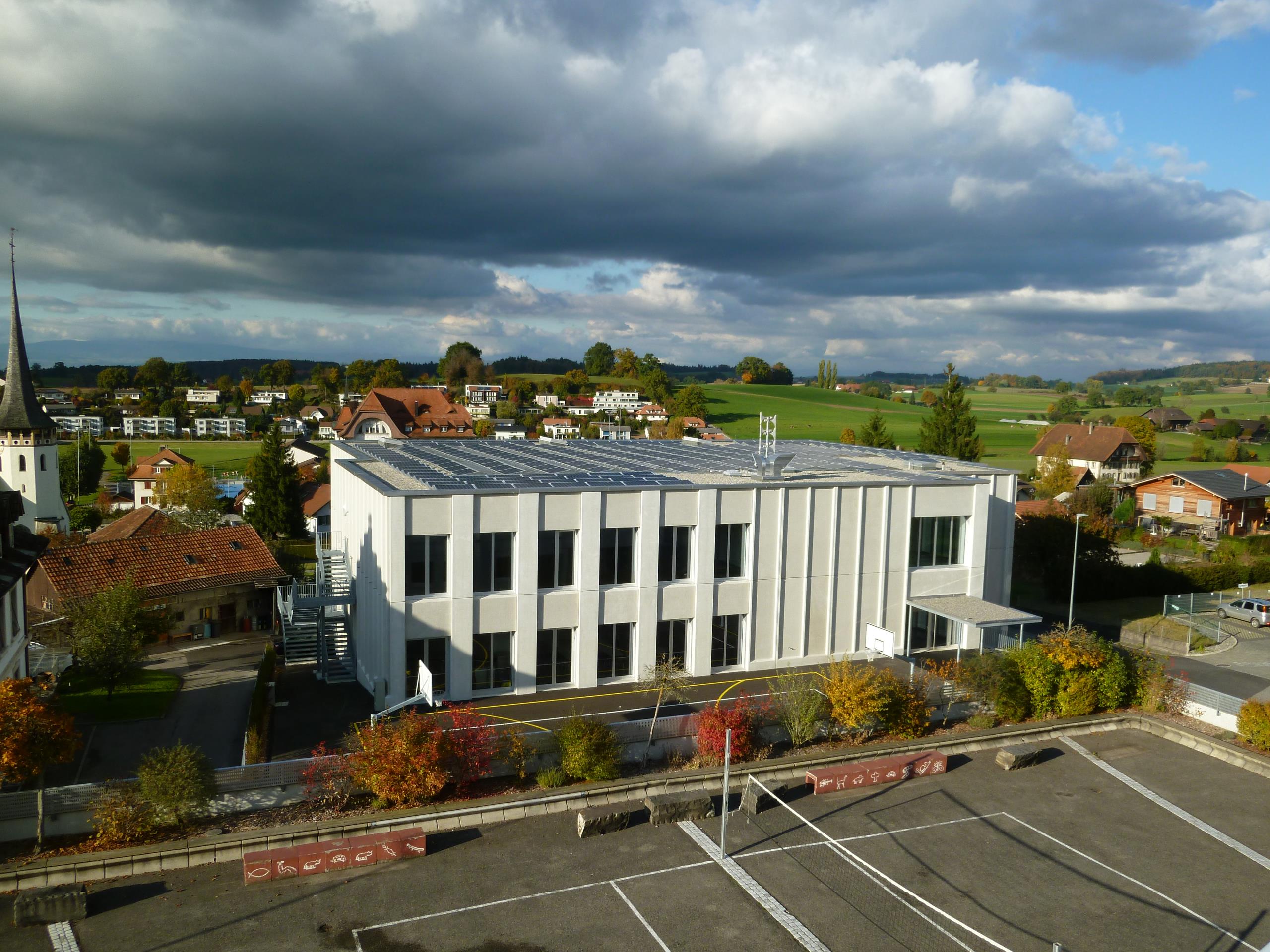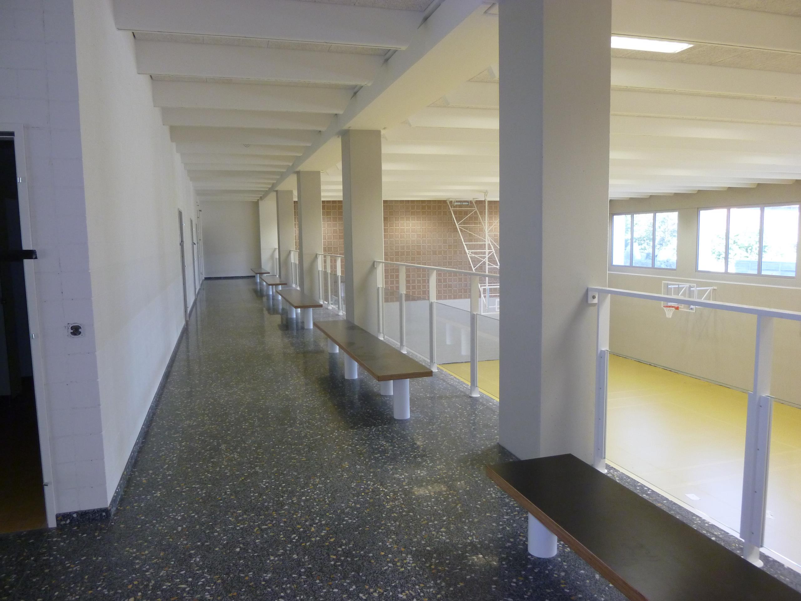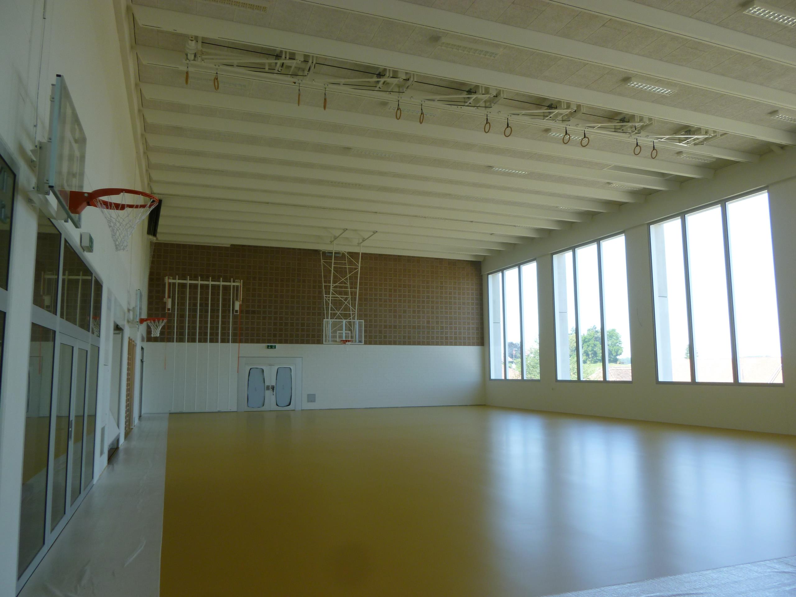 Die Sporthalle wurde auf Minergie-Standard umgebaut. Die schwierigkeit, bei diesem Umbau und Anbau, war das Architektonische mit den Leitungsführungen unter einen Hut zu bringen. Zum Umbau gehören Gymnastikraum, Bühne, Mehrzweckhalle, Spielhalle und ein neuer Lift inkl. Nottreppe dazu. Die Zweifachturnhalle ist sowohl auf den Bedarf der Schule als auch den Anforderungen an eine moderne Wettkampfstätte ausgelegt.