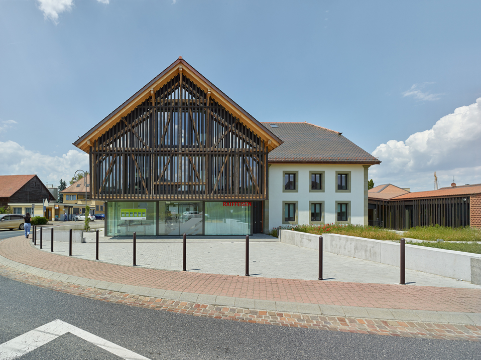 Umbau eines alten, denkmalgeschützten Bauernhauses zu einem neuen Hauptsitz (35 Mitarbeiter), in dem hauptsächlich die Schalter, Beratungsräume und Mitarbeiterbüros untergebracht sind, sowie Schaffung eines Nebengebäudes mit Cafeteria, Konferenzräumen und Tiefgarage.