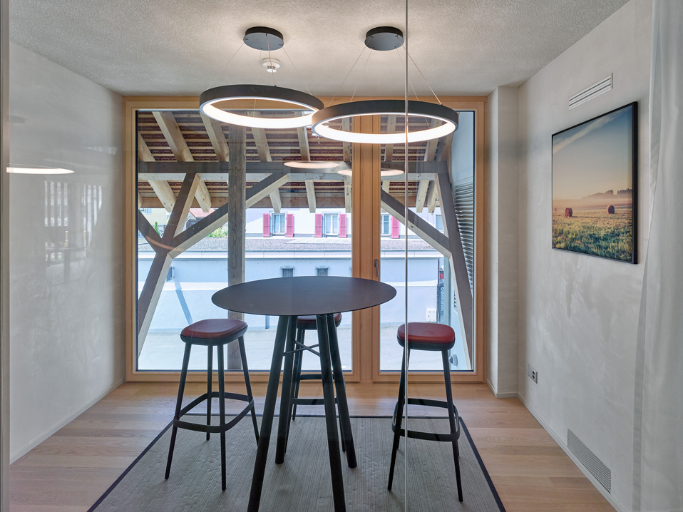 Die Sporthalle wurde auf Minergie-Standard umgebaut. Die schwierigkeit, bei diesem Umbau und Anbau, war das Architektonische mit den Leitungsführungen unter einen Hut zu bringen.